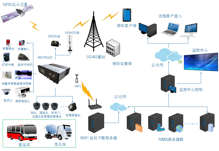 系統通過MDVR主機完成對音視頻、GPS、報警數據進行編碼、存儲。并通過3G/4G移動網絡完成音視頻、報警信息、GPS數據的上傳;同時實現設備遠程升級、參數修改、數字對講、遠程抓拍等遠程管理操作。